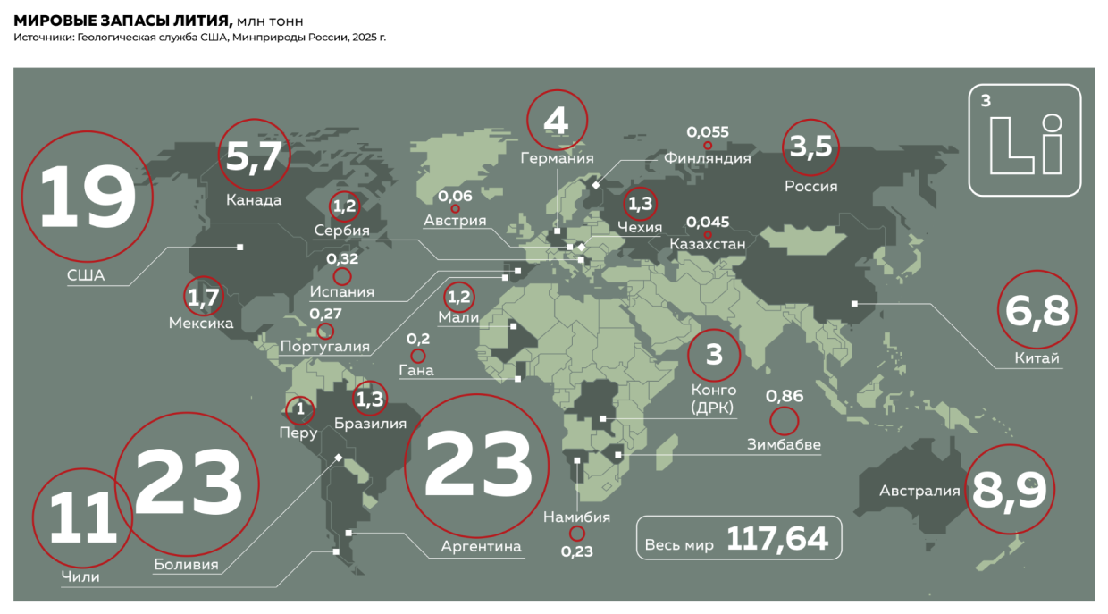 В целом ожидается, что в предстоящее десятилетие потребление лития в мире увеличится вчетверо, с 200 тыс. до 800 тыс. тонн в год — такую оценку в мае 2025-го привел глава Роснедр Олег Казанов.