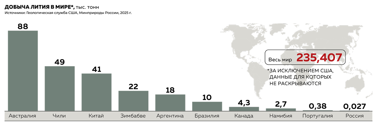 97% мировой добычи лития (228 тыс. из 235 тыс. тонн в год) обеспечивают всего шесть стран: Австралия, Чили, Китай, Зимбабве, Аргентина и Бразилия. США среди ведущих производителей и поставщиков этого металла нет — свой спрос Штаты покрывают за счет импорта, главным образом из Чили (50% импорта США в 2020–2023 годах) и Аргентины (47%).